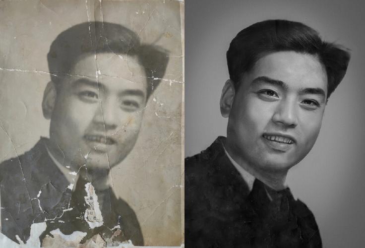 高级修复: 原图保存不好 破损面积较大 模糊程度严重 这样的照片只能参考原图信息 作全面的翻新 当然原图清晰的也可以做高级修复 因为看的更准确 做出来的效果也越好 高级修复是目前老照片修复中难度比较大的一种技术 利用移植 合成等多种技术结合 还得有绘画欣赏修复能力和扎实的PS基本功才能完成 因为工絮太过复杂 要用到大量的素材 所以高级修复只针对单人半身的老照片 全身的涉及时间素材和客人承受能力的问题 一般都不做高级修复。